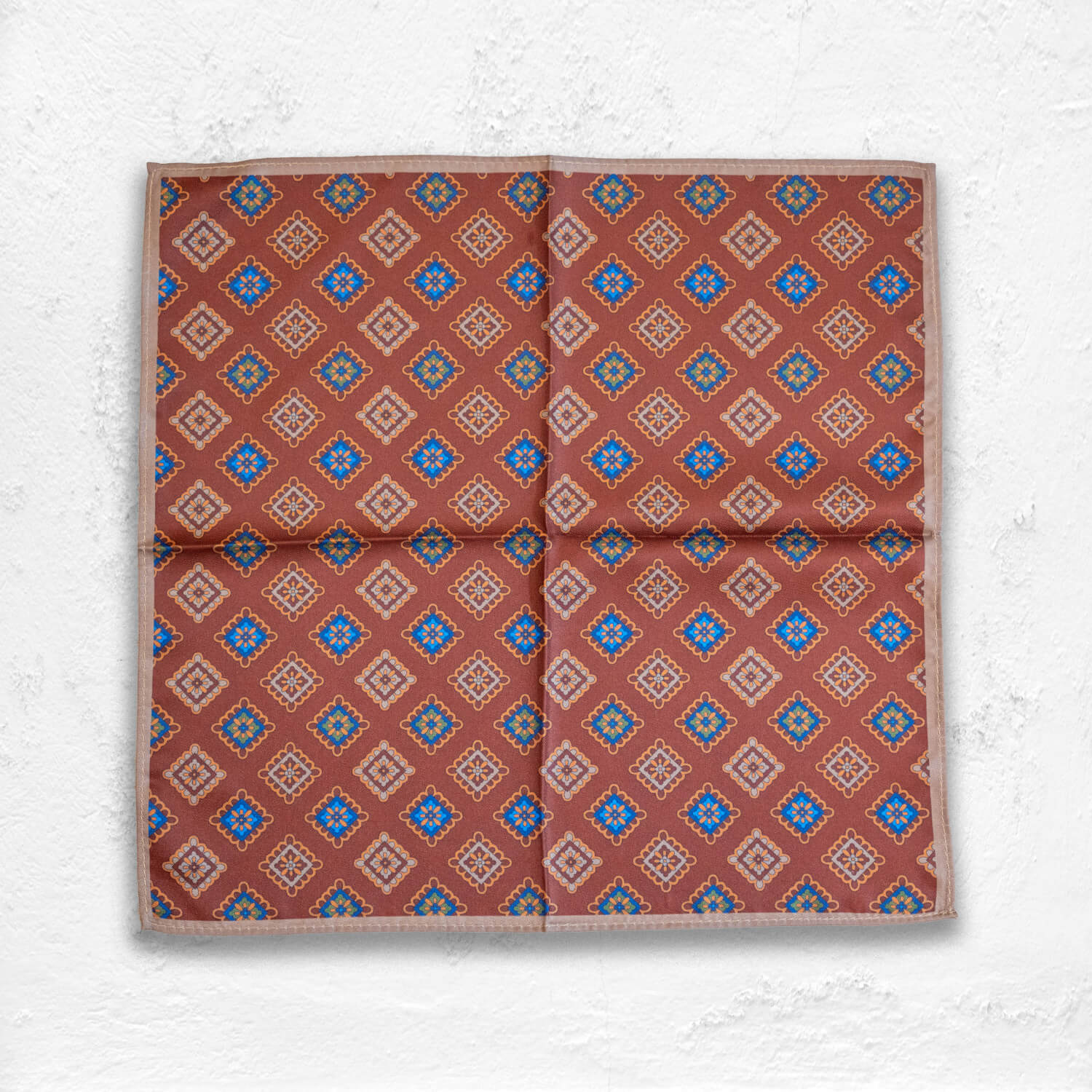 Introducing Copper Diamond, a meticulously crafted satin pocket square designed to enrich your wardrobe with warm sophistication. Measuring 13 inches (33 cm), this accessory features a striking copper-toned base adorned with geometric blue diamond motifs, creating a balanced blend of classic and contemporary style. The satin fabric carries a subtle sheen that elevates the intricate pattern, making it the ideal choice for weddings, receptions, and refined celebrations.
