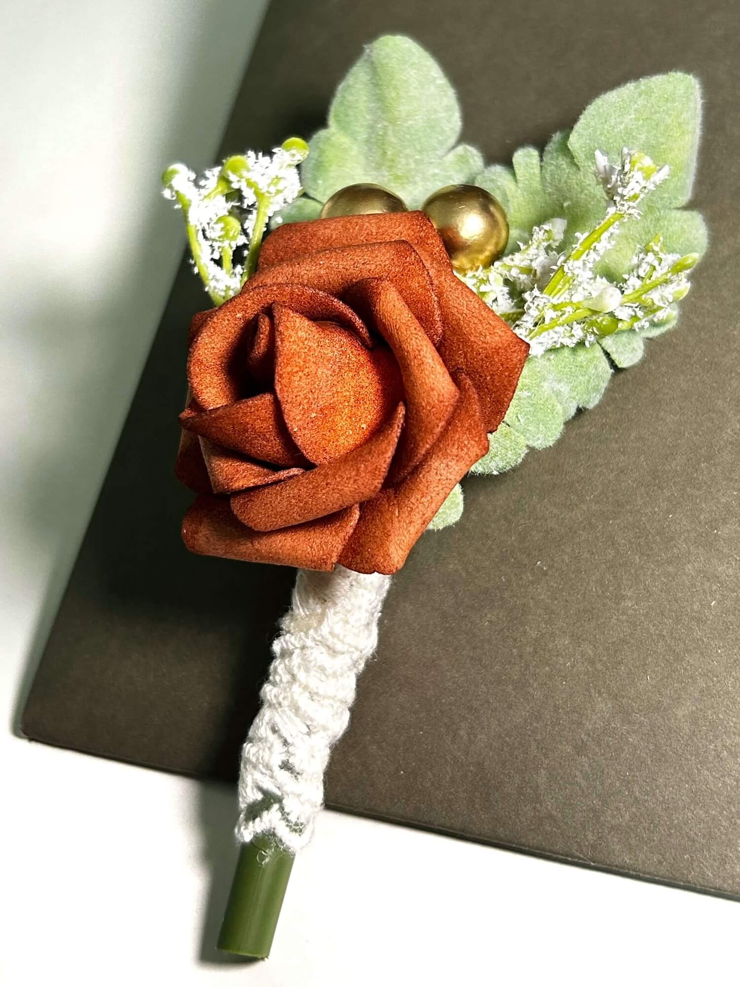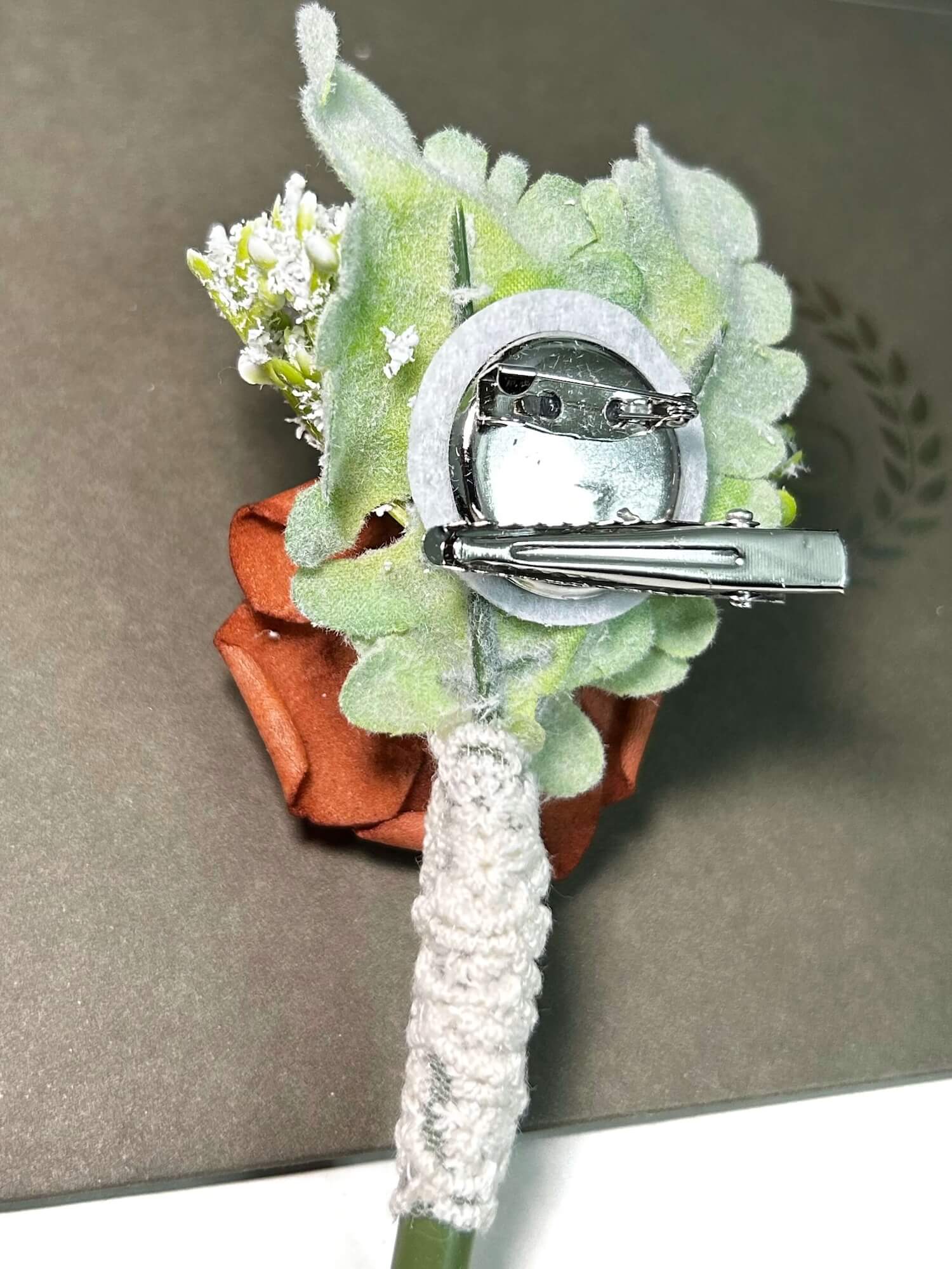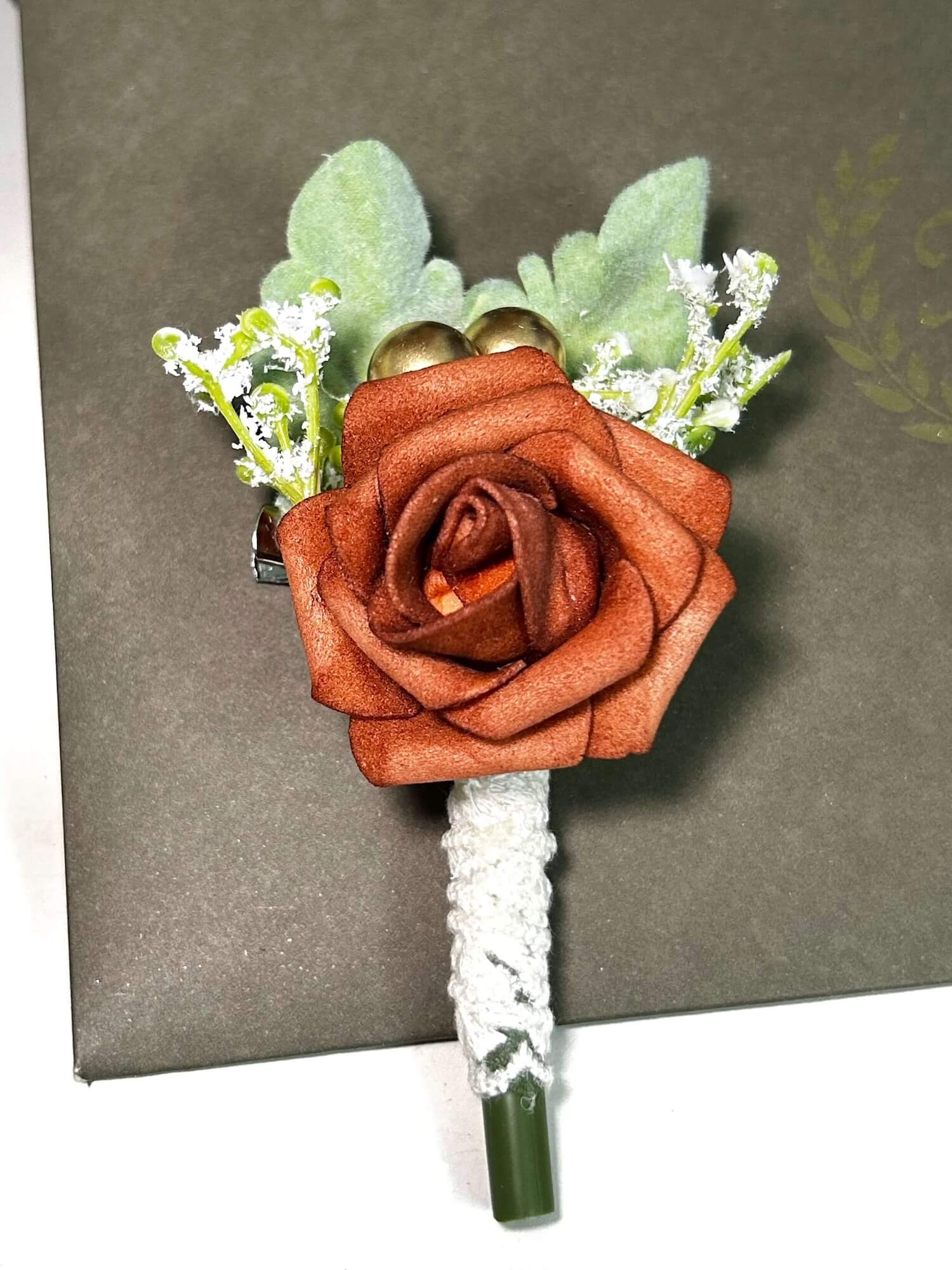 The intricate craftsmanship behind this boutonniere adds a touch of understated luxury. The carefully shaped rose blooms are arranged to create a visually striking and refined accessory that complements a range of outfits, from classic suits to more contemporary ensembles.