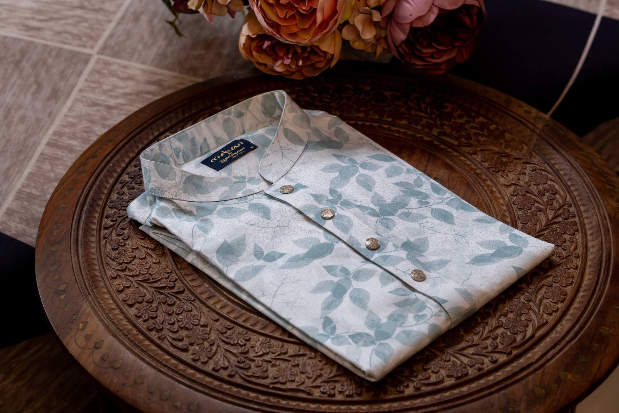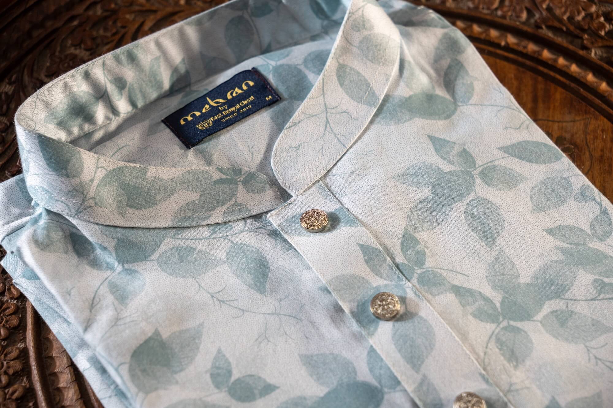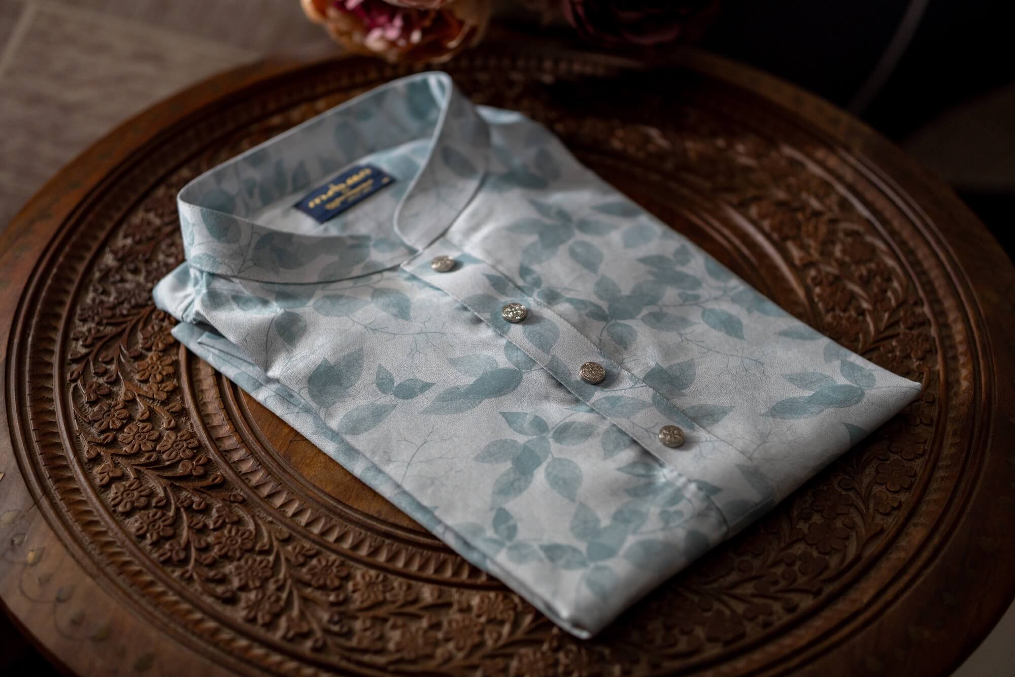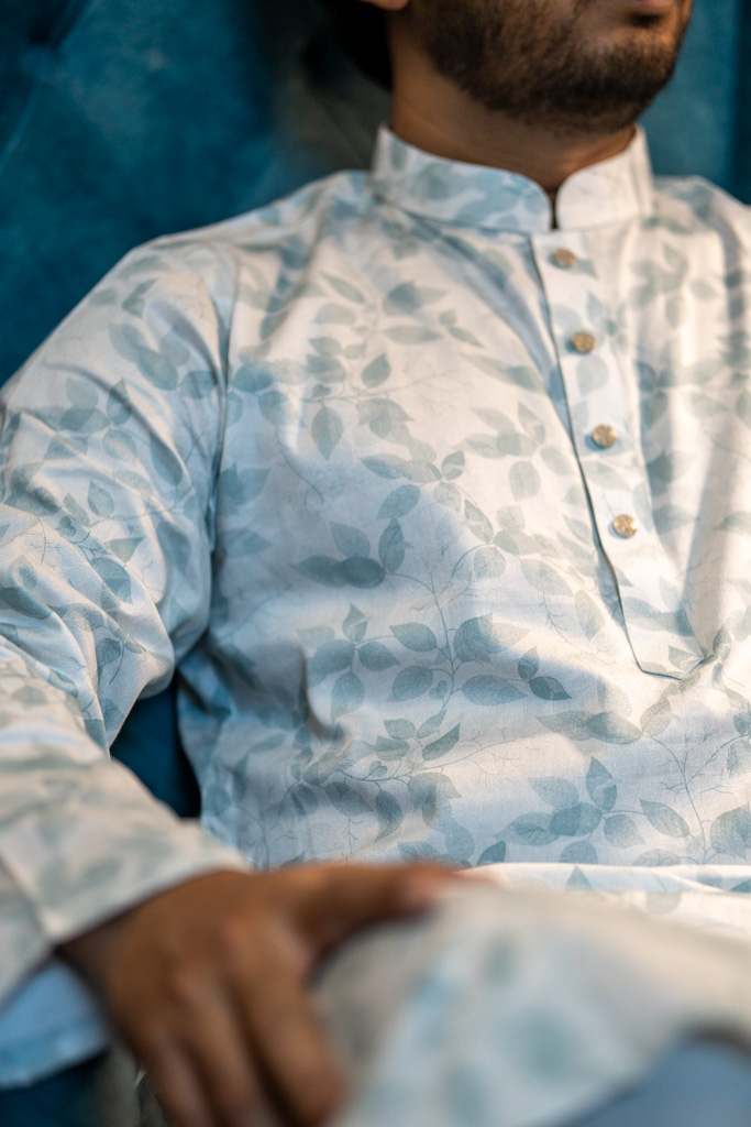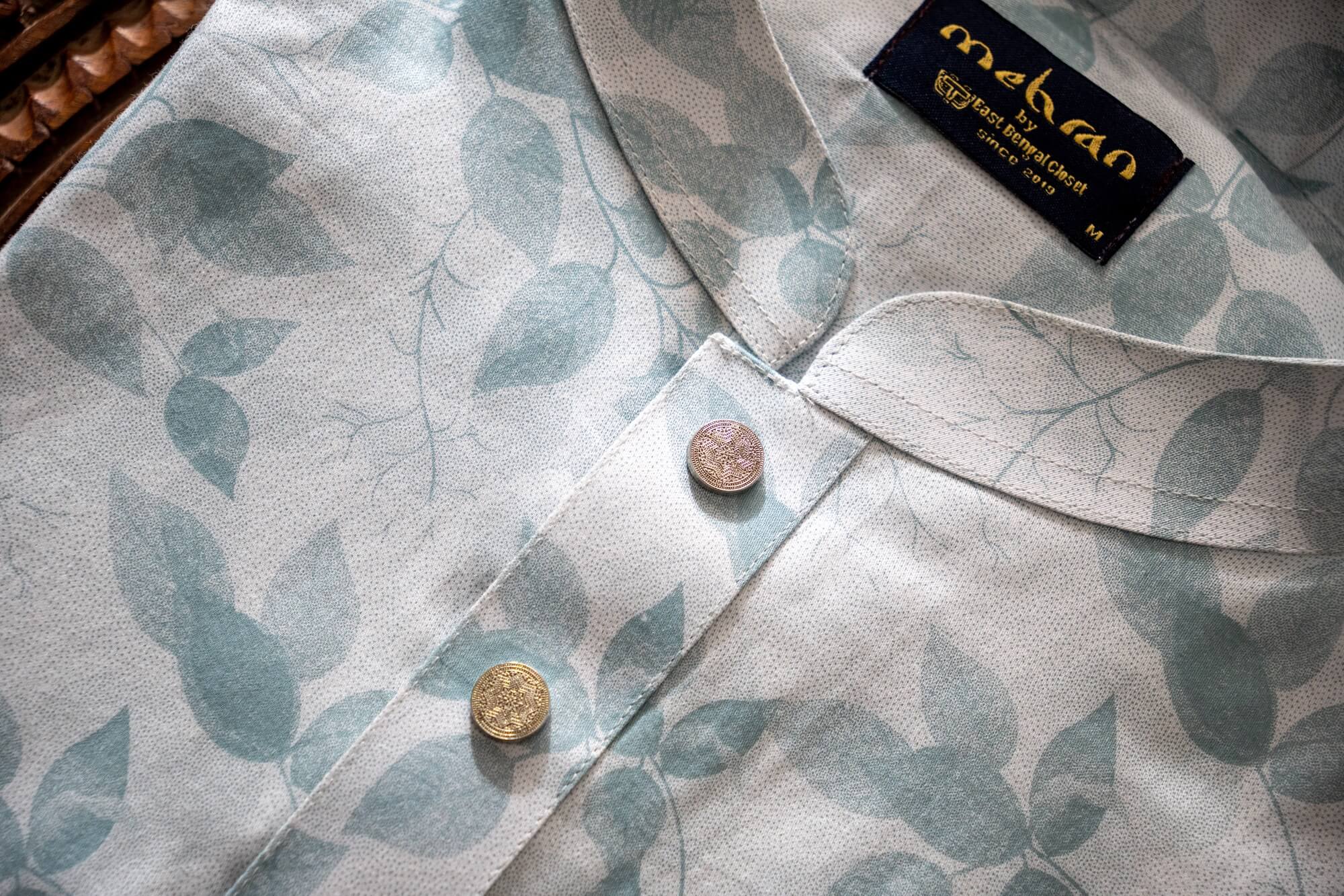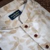 - Soft ivory base with delicate leaf-patterned print