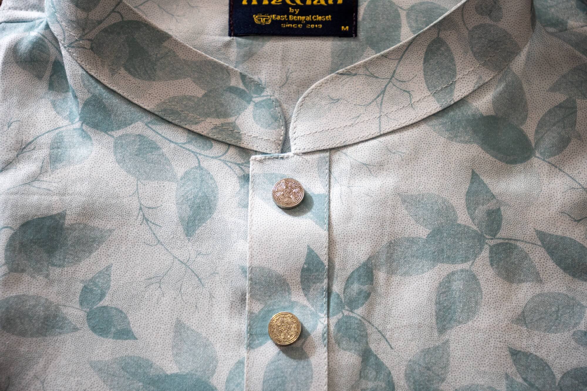 - Contrasting beige band collar for a touch of modernity