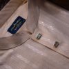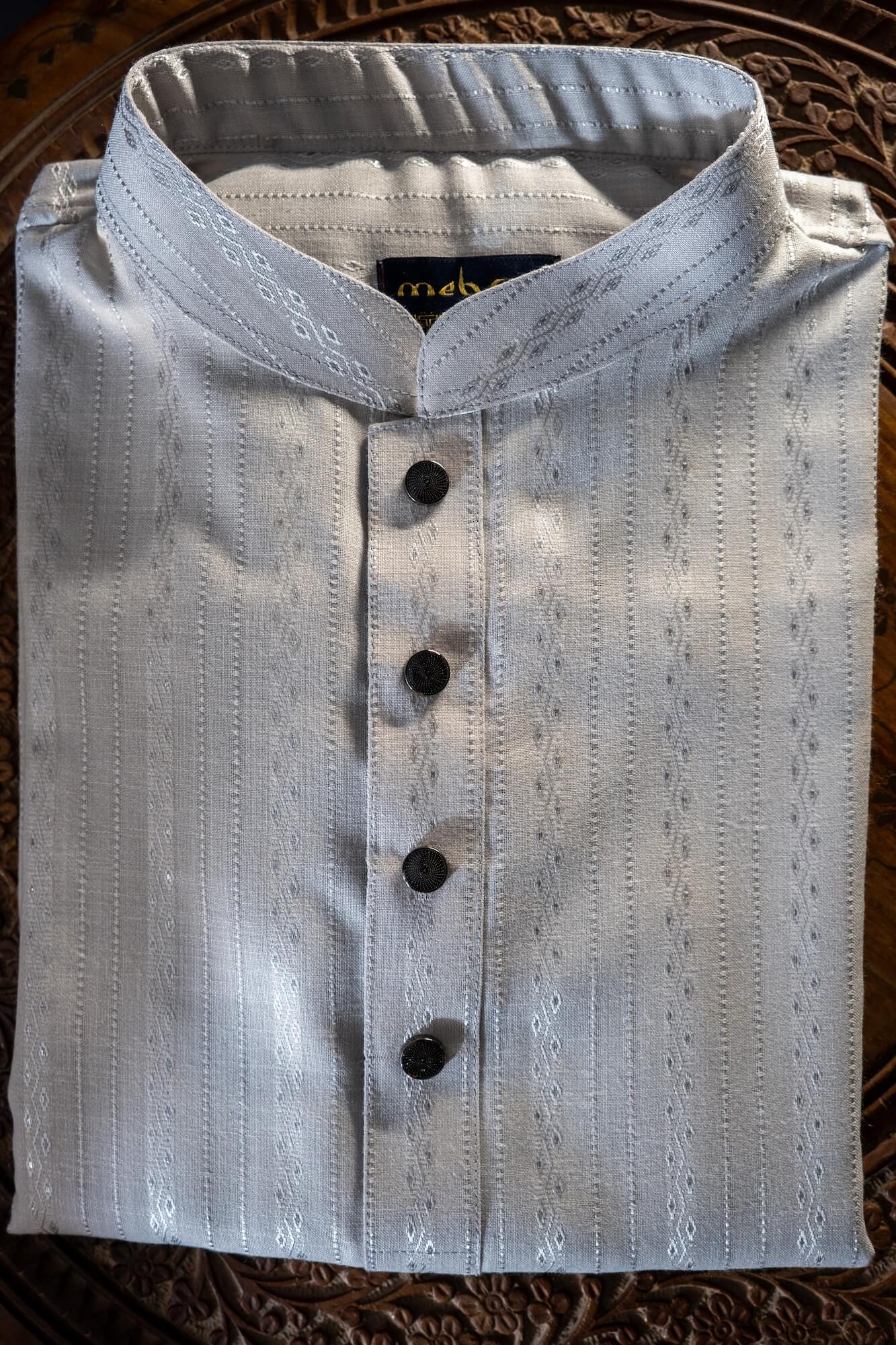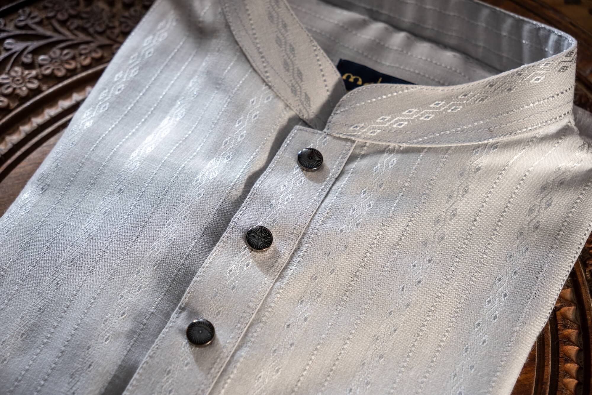 - Classic band collar with a modern silhouette